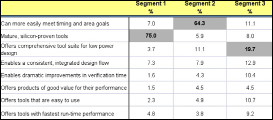 In this example, Beacon conducted a needs-based segmentation with data derived from a MaxDiff conjoint analysis for a major CAD software supplier. Respondents are grouped into three different segments based on different levels of utility each of these groups places on selection attributes. Respondents in Segment 1 value "mature" tools above all else, while Segment 2 respondents care far less about maturity of their design tools but far more about functionality and what can be done with the tools.
