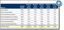 "Reach" measures the overall "noise level" in the market as well as how effective a specific brand is in reaching its target audience (net unduplicated reach). From the results, we can then determine the effectiveness of a company's marketing methods (see example right) in driving consideration or preference for a brand. |